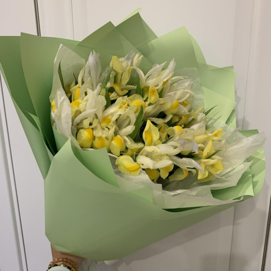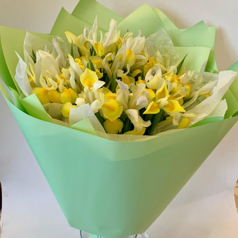 На фото букет из 49 желтых ирисов. В составе: ирис 49 шт, дизайнерская упаковка 1 шт, брасика 1 шт, . Все цветы свежие и ароматные, букет красиво оформлен и отлично подходит для подарка. Доступна доставка цветов или самовывоз.